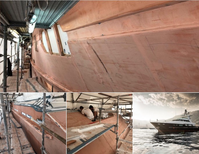 Work in progress in Palma de Mallorca where the Pinmar team is working on the refit of the New Zealand built M/Y T6. In these pictures you can see the Boero YachtCoatings Epoyacht filler at work and soon we will see the 49 meter yacht back in the water with the full paint system on.